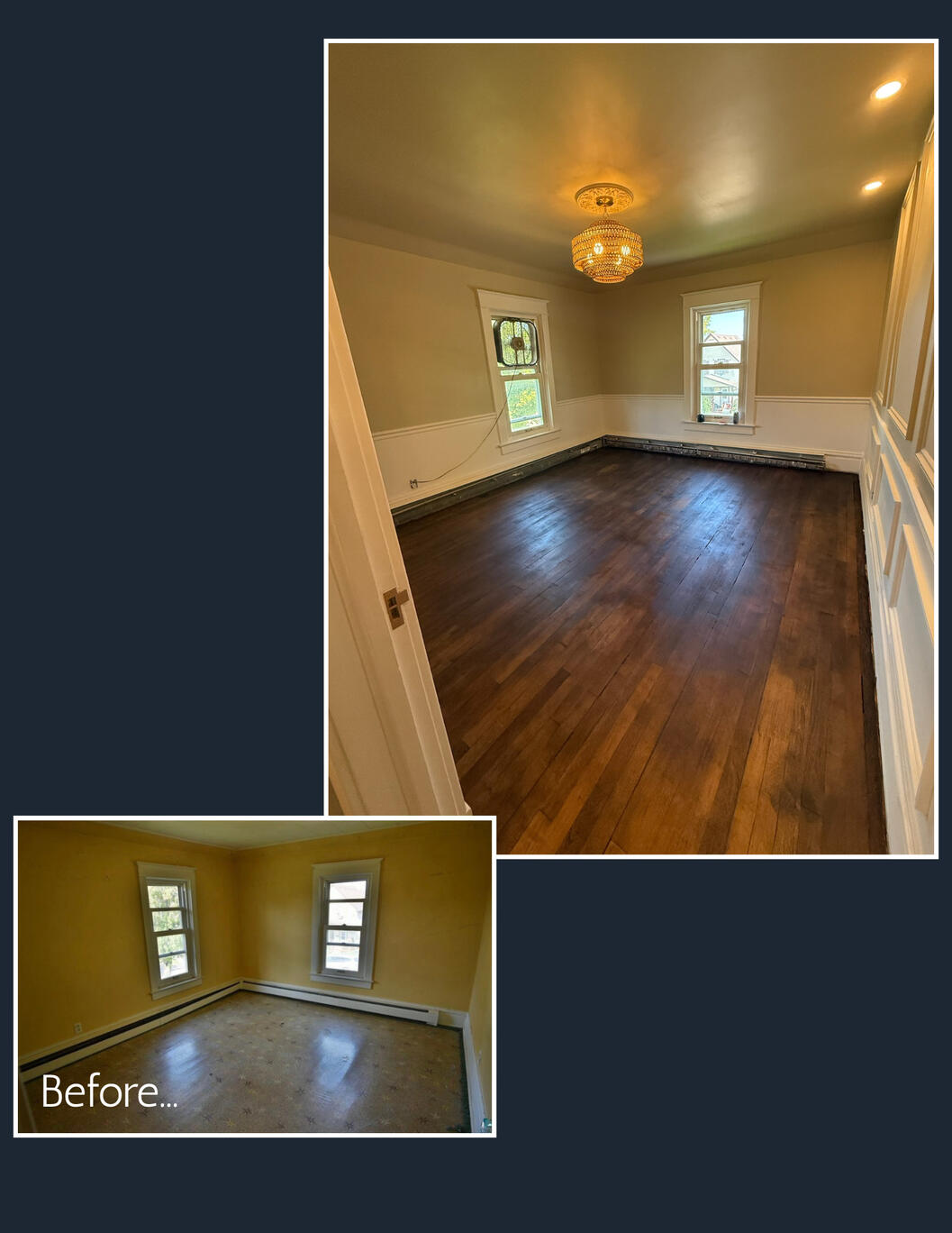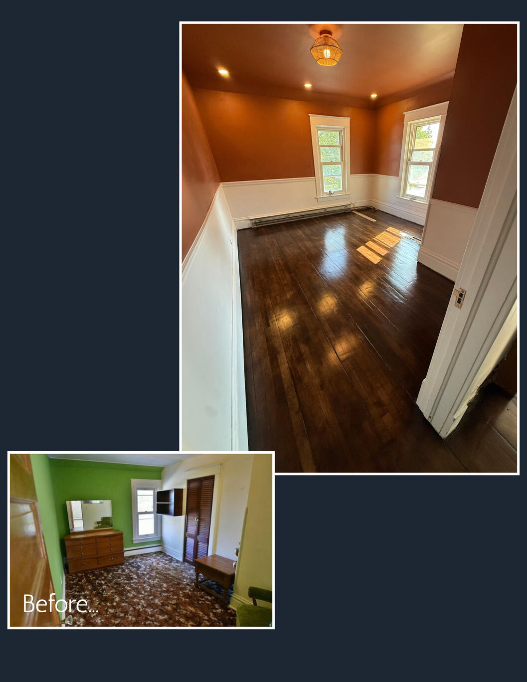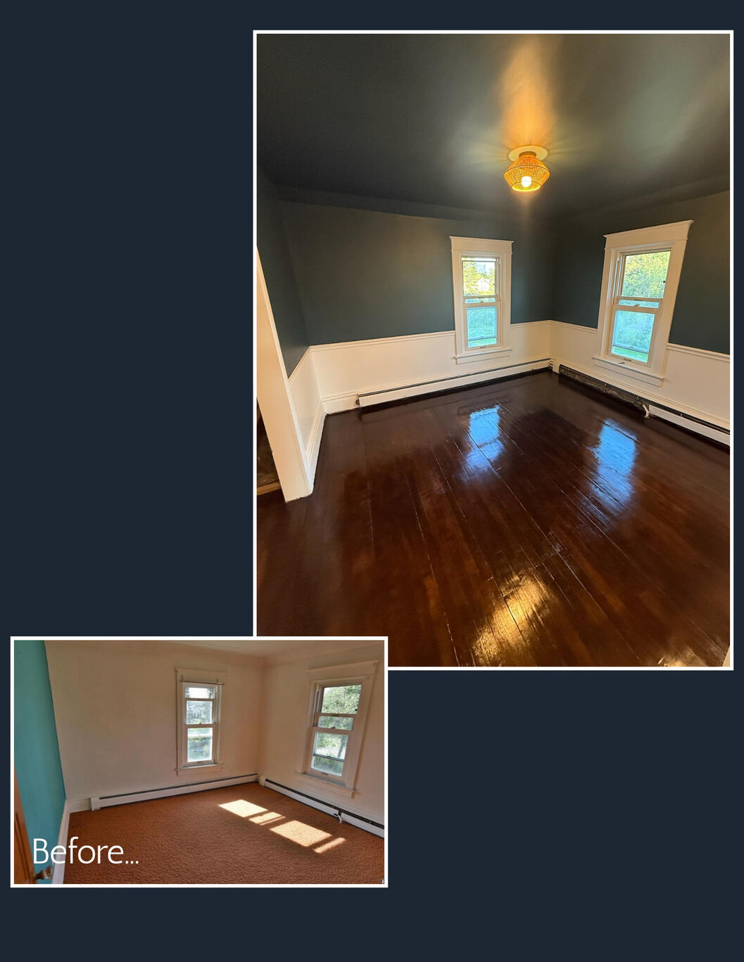 This three-bedroom interior refresh focused on removing dated finishes and restoring the original character of the home. The project included full carpet and linoleum removal, extensive plaster repair, coordination of professional hardwood floor refinishing, installation of chair molding, finishing custom walk in closet, and complete repainting of walls and trim throughout all three rooms. Careful surface preparation and consistent detailing ensured a cohesive finish from room to room.