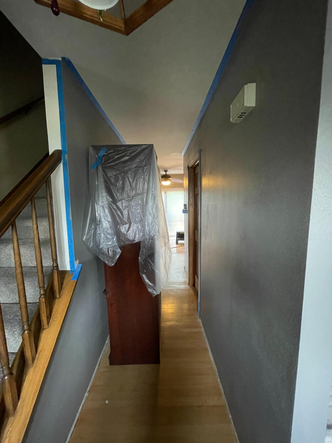 This project involved removing existing wall cabinets and refreshing a kitchen and adjoining hallway to improve brightness and overall flow in two high-visibility areas of the home. Minor surface repairs were completed prior to painting, followed by full repainting of walls and trim to deliver a clean, cohesive finish.